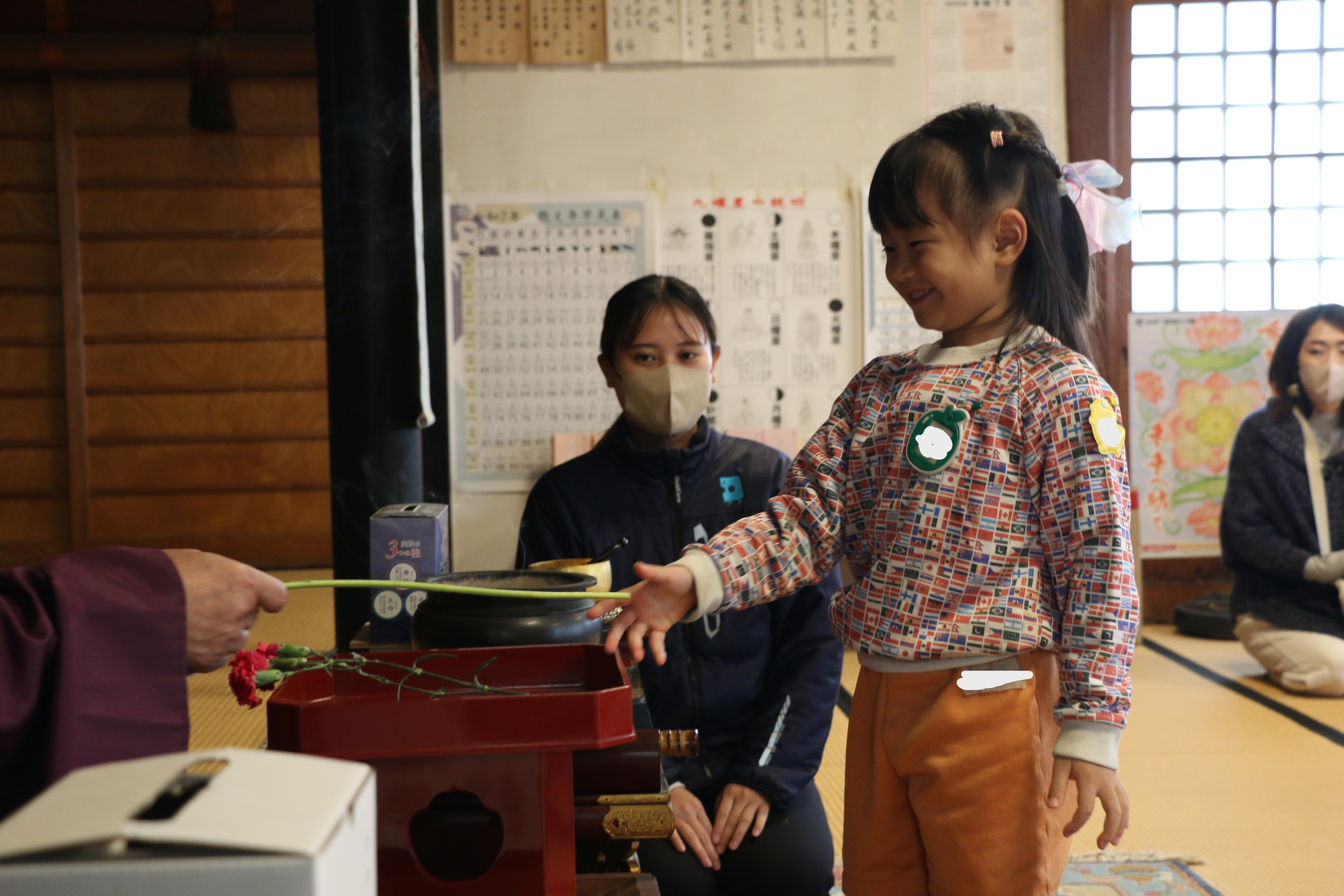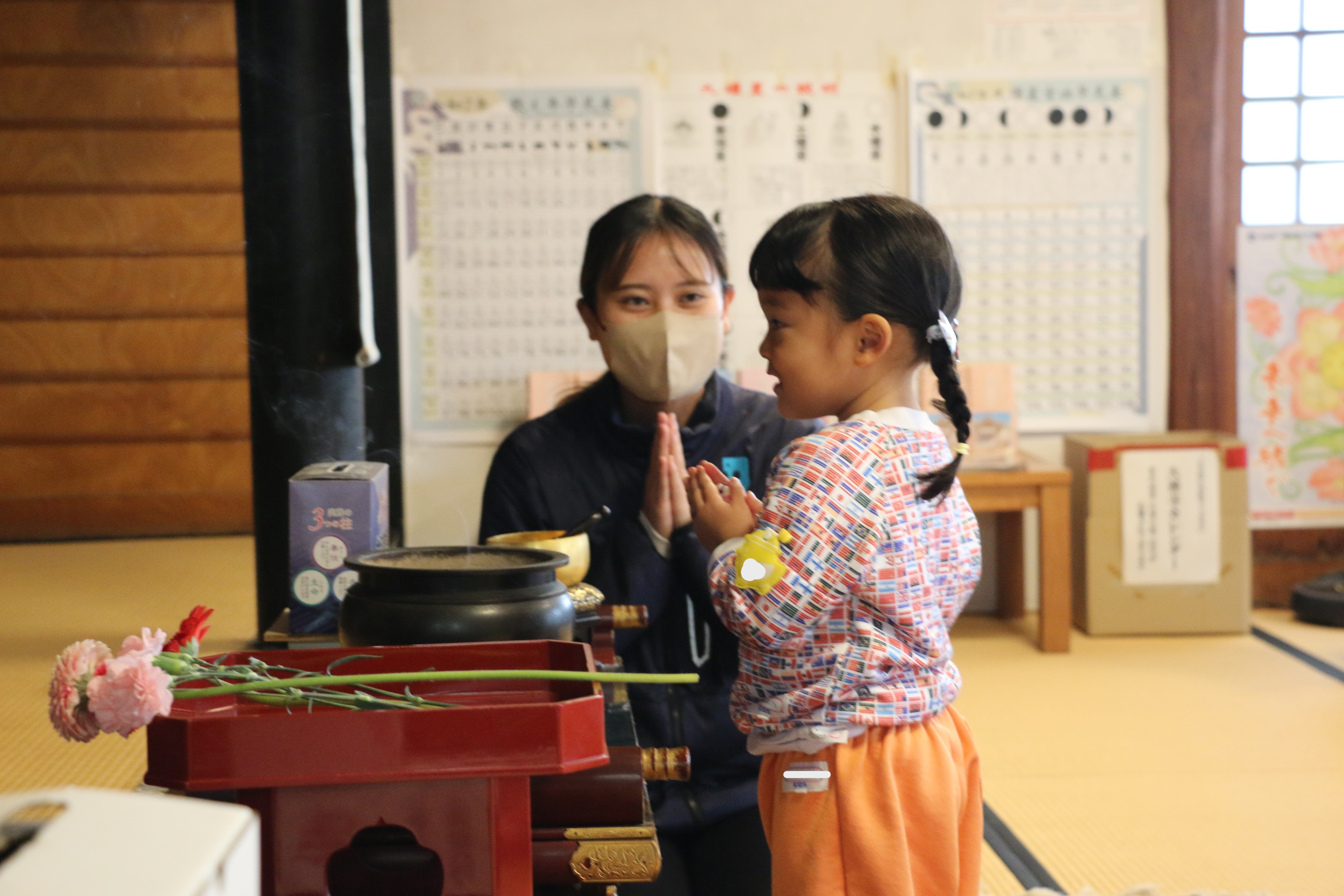 少し緊張しているお友達もいましたが、いつもみんなのことを見守っている仏様にお花をお供えし、手を合わせてお祈りをすることができましたよ✨