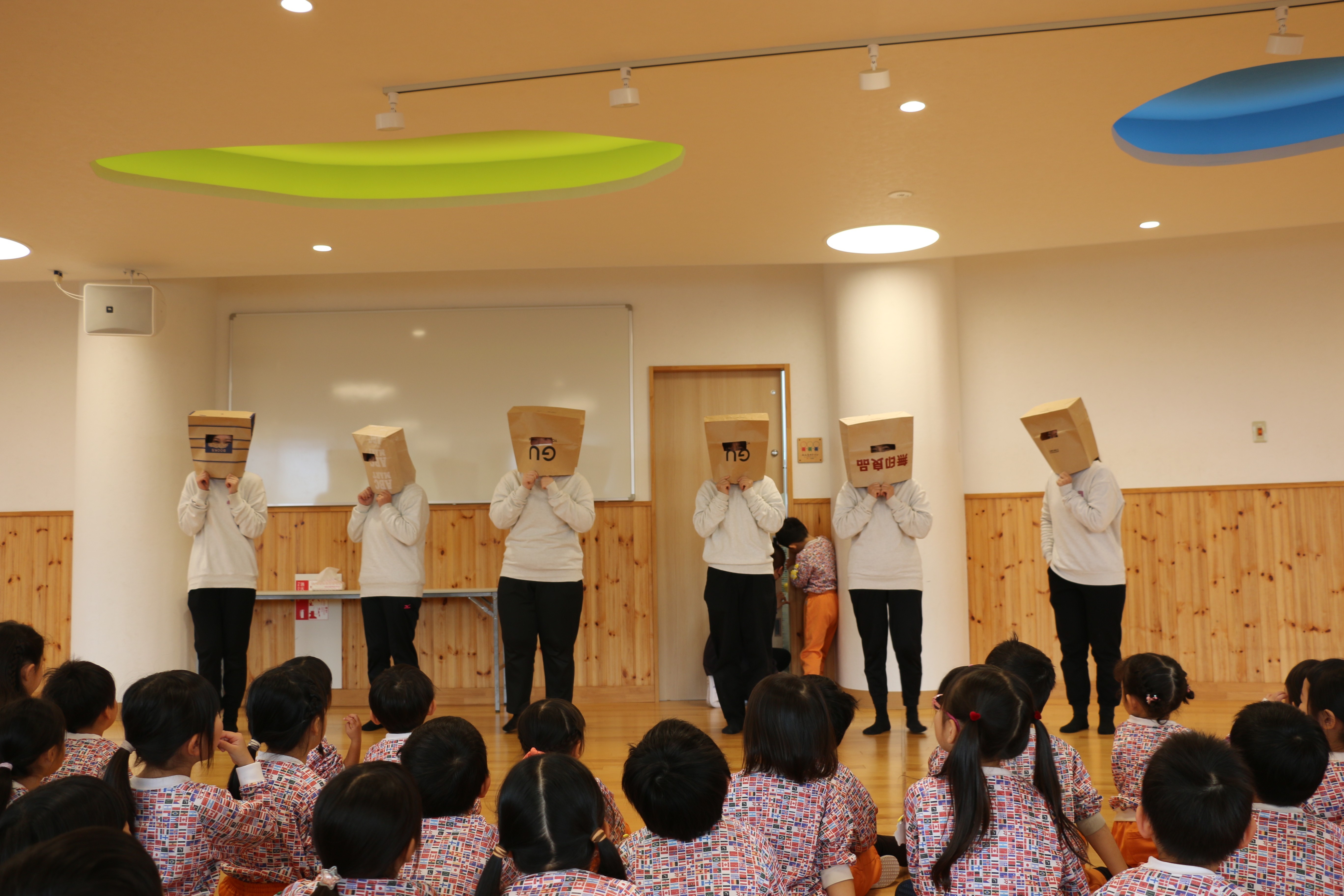 今回の出し物は【誰先生でしょうクイズ】を行いました。紙袋を被っている先生に質問をし、誰先生が入っているのか当ててもらいました😂