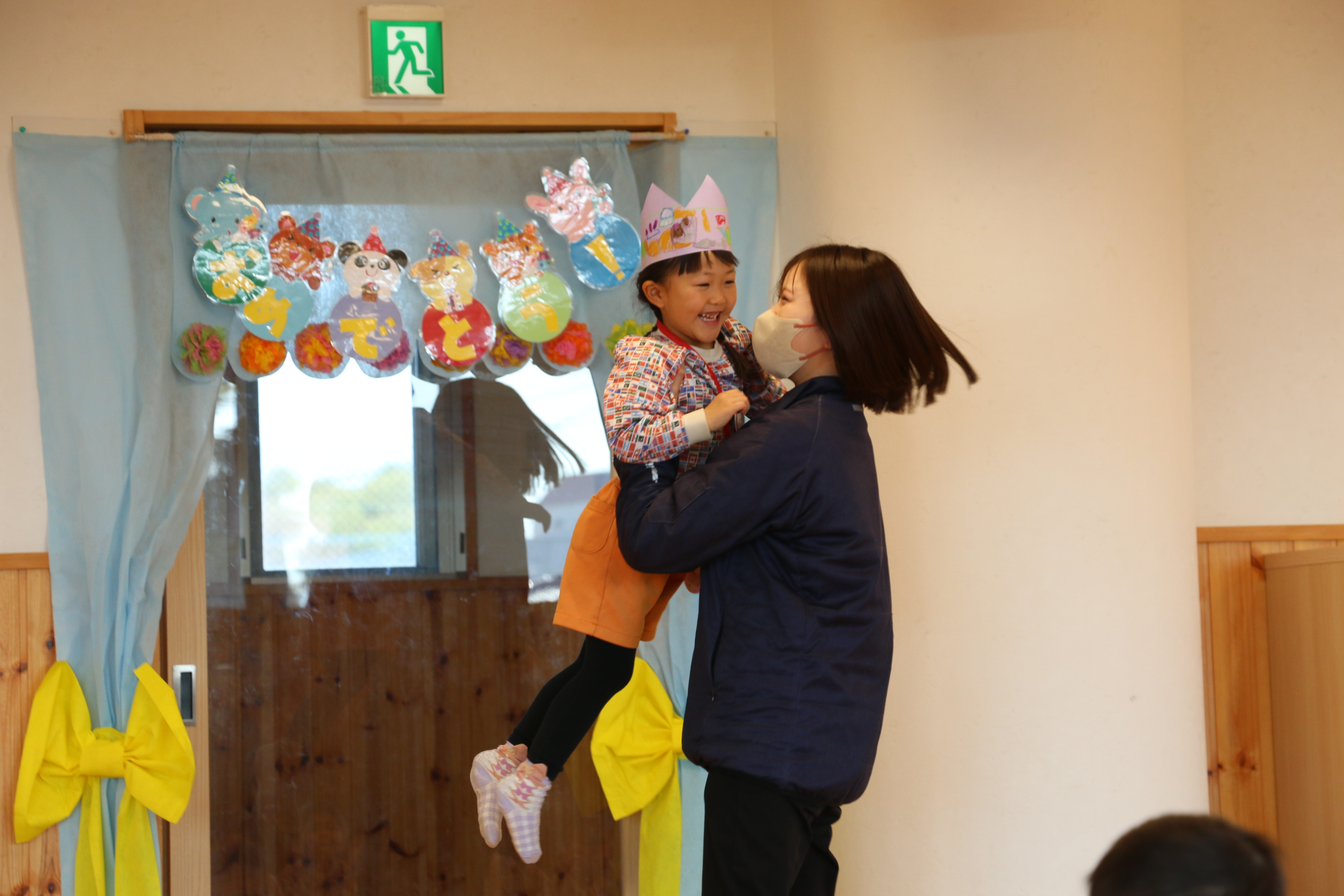 その後理事長先生から、「お家の人にいつもありがとうの気持ちを持つことが大切だよ」というお話を聞いた後、みんなが待っているお遊戯室へ向かいました!