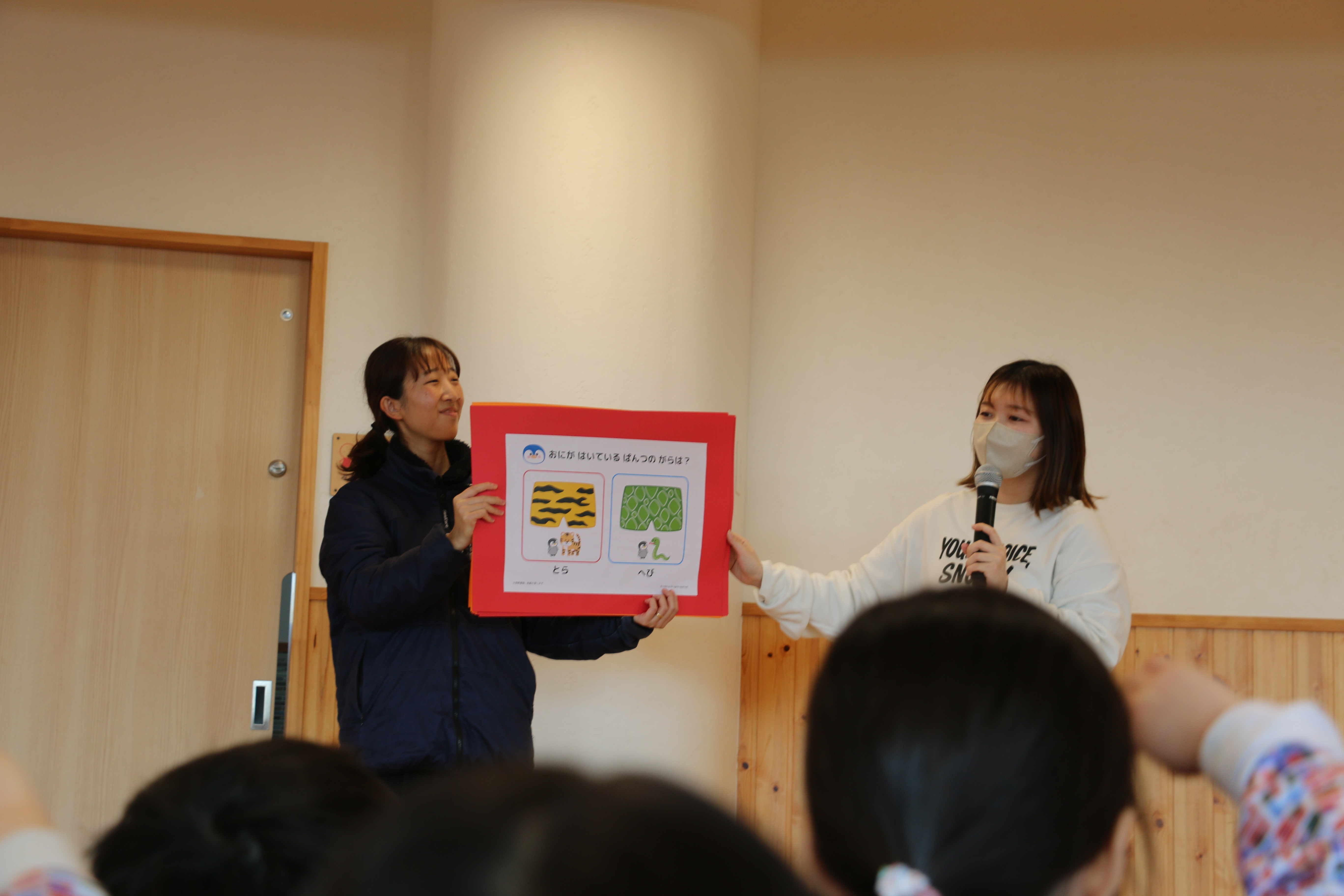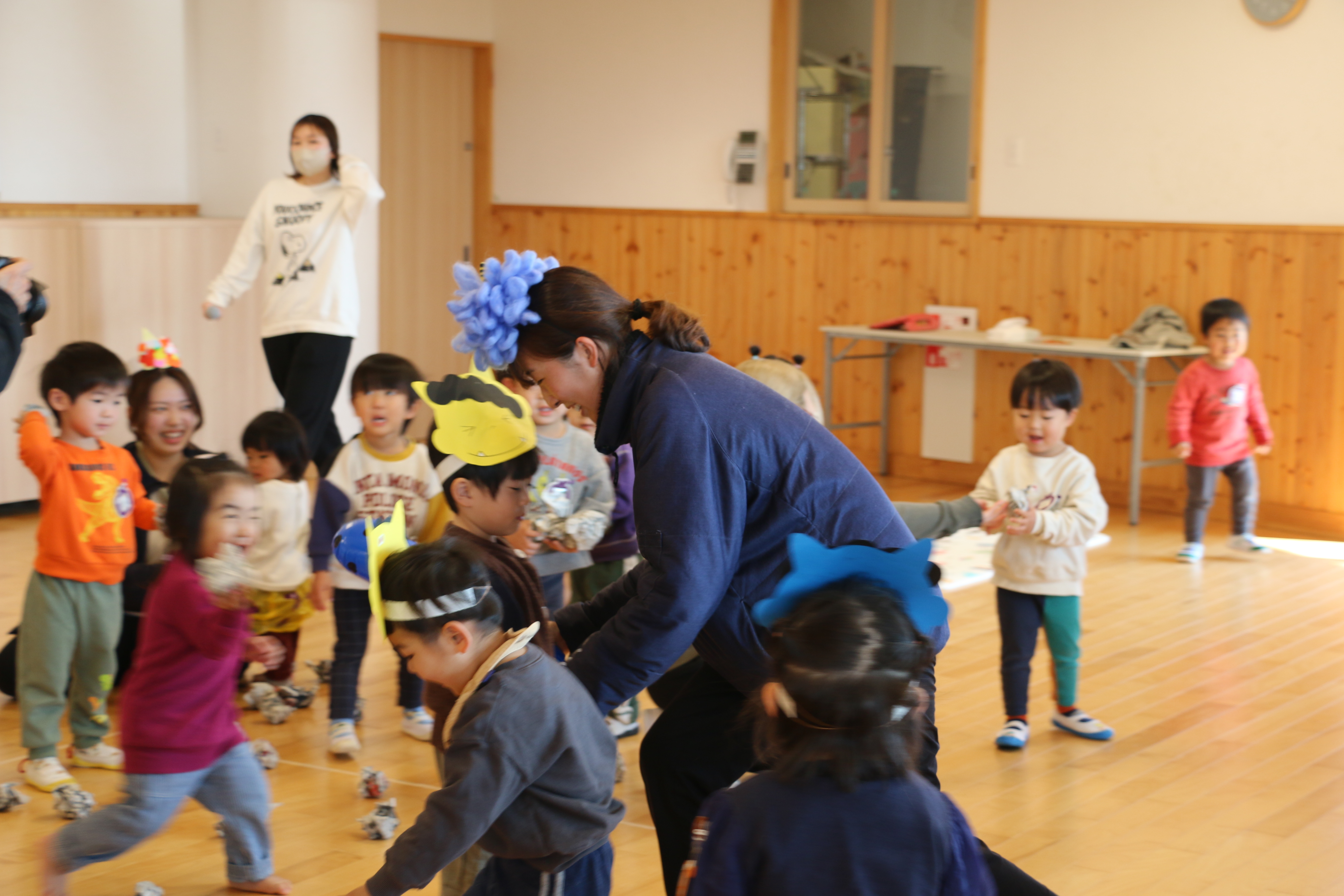まず初めに「せつぶんクイズ♪」をしました!「なぜ豆まきをするのか?」「鬼の嫌いな魚は?」等難しいクイズもあり、子ども達はそのたびに元気にクイズに答えてましたよ✨正解すると「やったーー」と大喜びでした😊