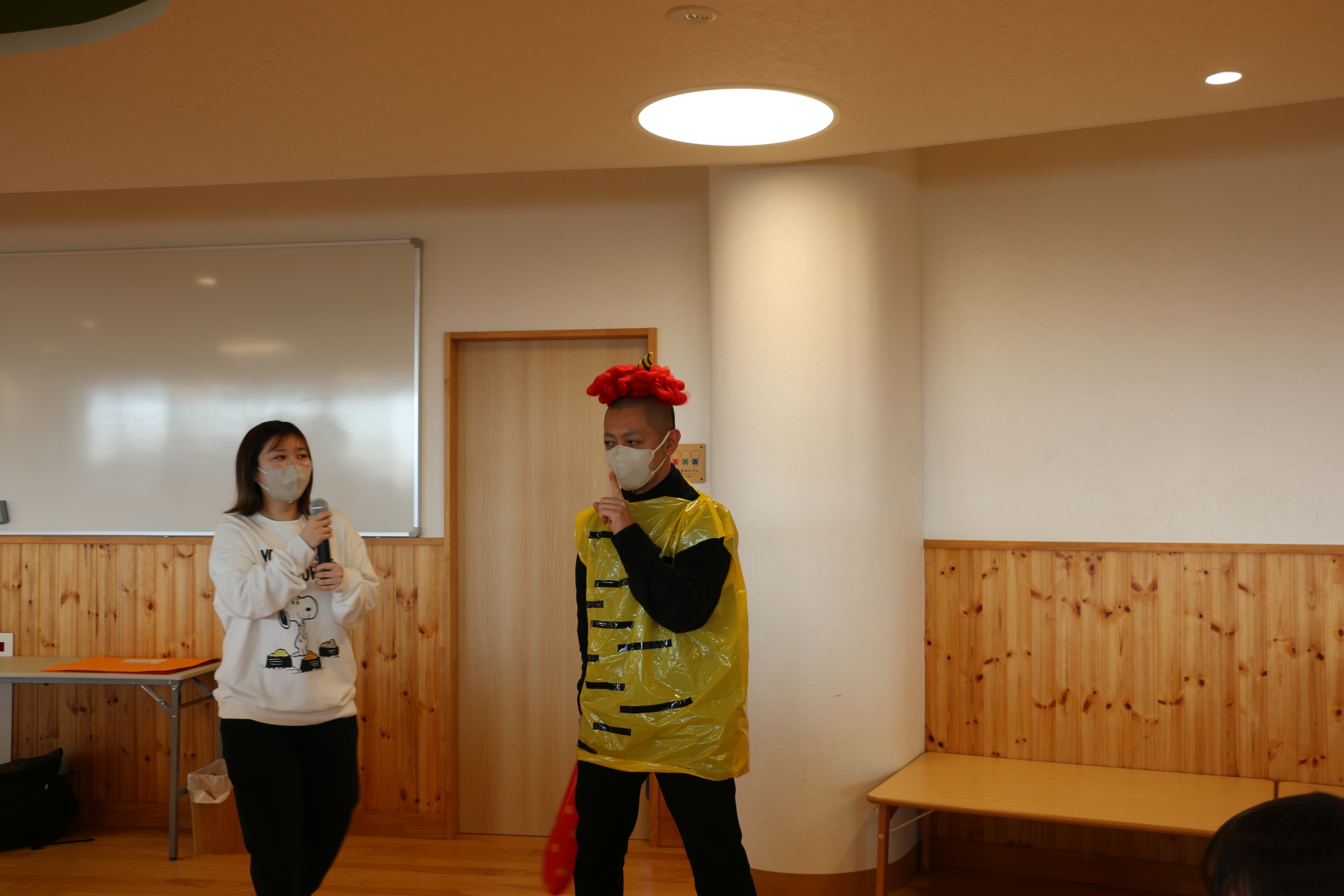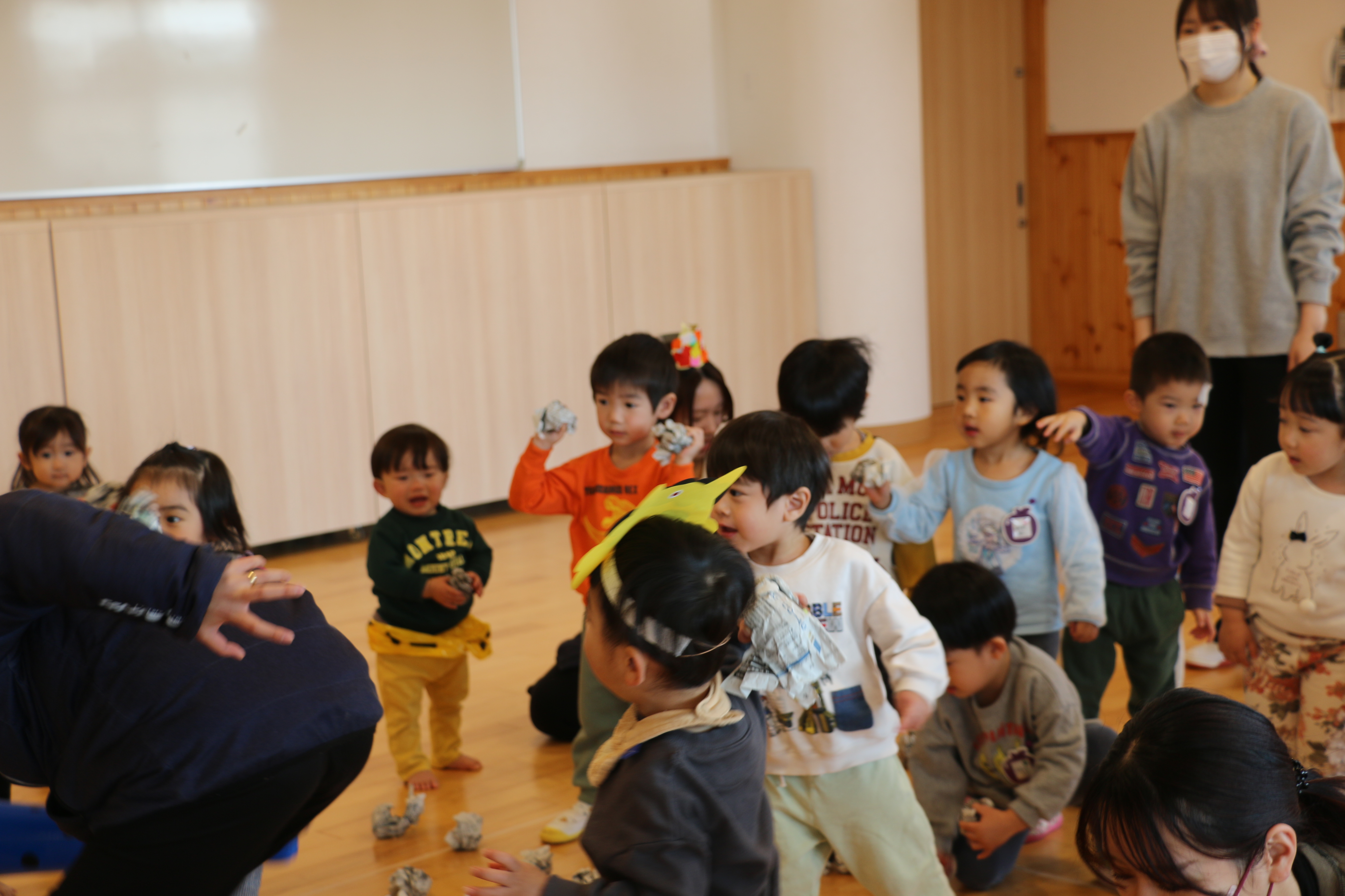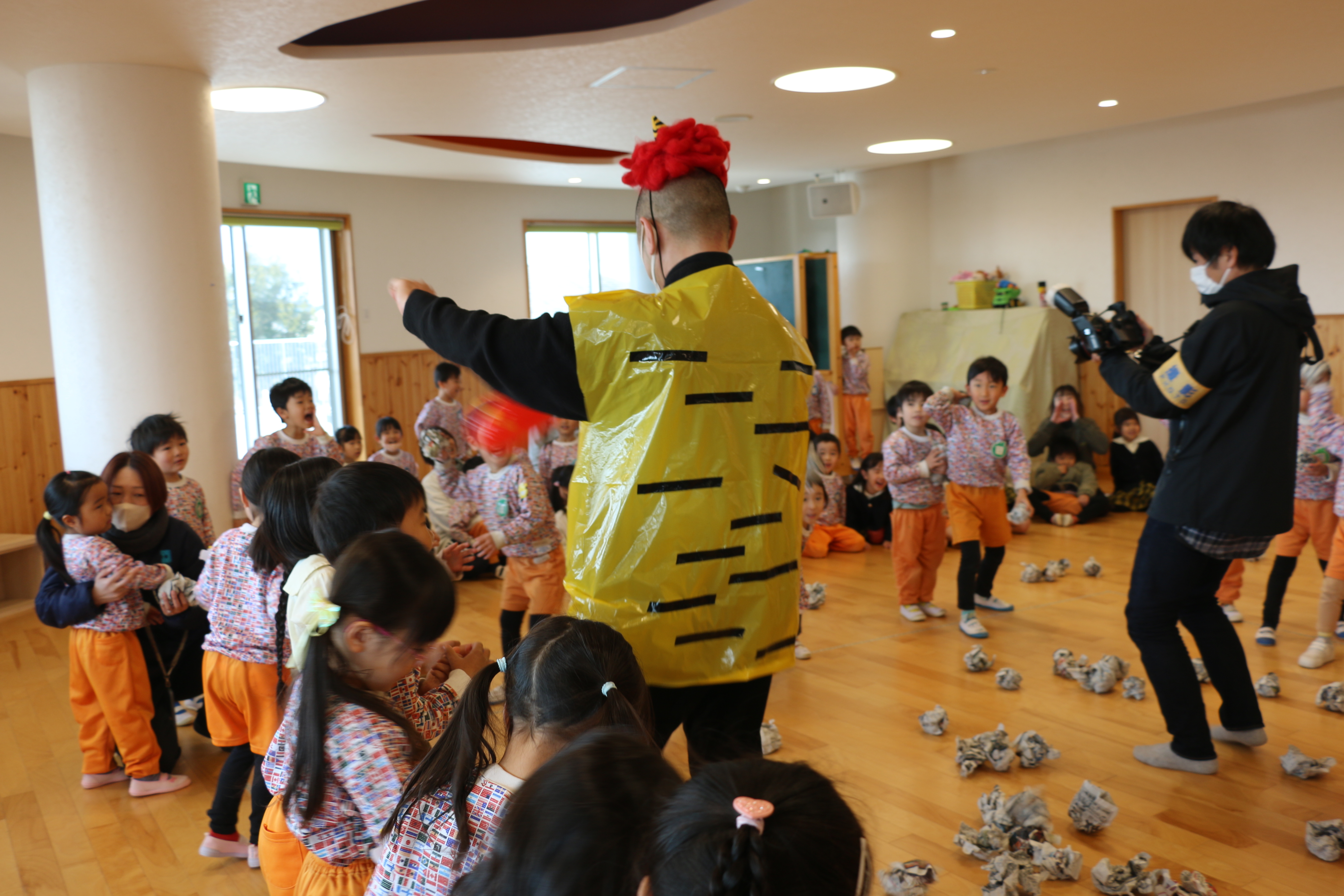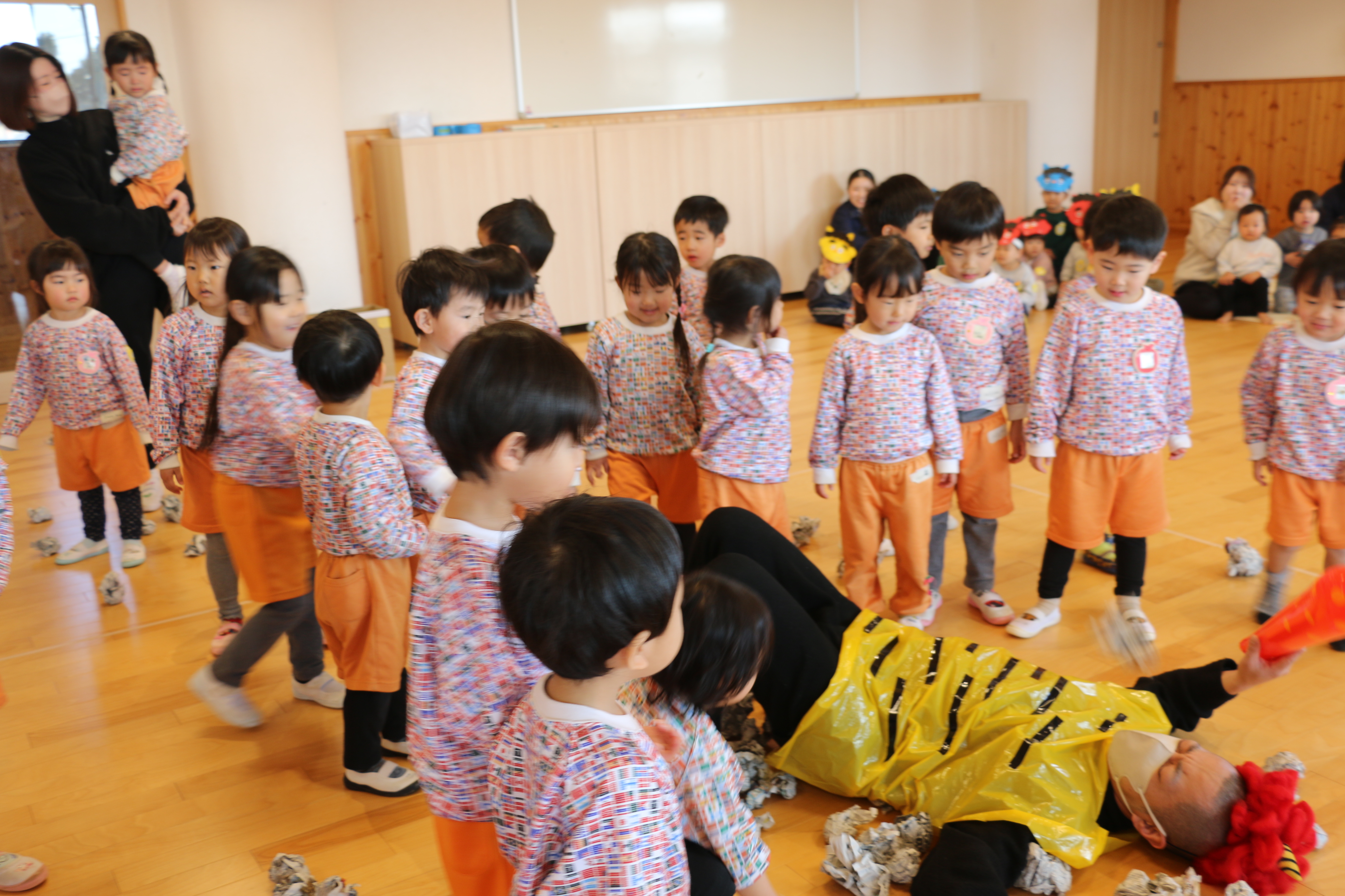 なんと今年は、、、園長先生が赤鬼として登場!!!階段の下から登場し、扉の向こうから年長さんたちは鬼に気づき大興奮!!一方で何も見えない未満児さんたちは怖くて泣いているお友達もいました🤭園長先生の顔が見えるとホッとして「えんちょうせんせいだー」と楽しそうでした✨